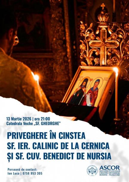 Începând cu ora 21.00, la Catedrala Veche „Sfântul Gheorghe” din Iași, va avea loc Privegherea în cinstea Sfântului Ierarh Calinic de la Cernica și a Sfântului Cuvios Benedict de Nursia, organizată de ASCOR Iași. Evenimentul se adresează studenților și publicului larg.