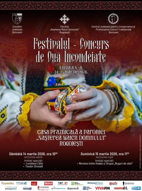 În perioada 14–15 martie 2026 va avea loc Festivalul-Concurs de Ouă Încondeiate, la Casa Praznicală a Parohiei „Nașterea Maicii Domnului” – Rogojești. Evenimentul este organizat cu sprijinul Consiliului Județean Botoșani și al Centrului Județean pentru Conservarea și Promovarea Culturii Tradiționale Botoșani. În această zi, începând cu ora 10.00, va avea loc secțiunea destinată adulților. Invitații speciali ai acestei zile sunt Loredana Călin și Teodor Gireadă, iar duminică, 15 martie 2026, de la ora 11.00, se va desfășura secțiunea dedicată copiilor, avându-i ca invitați speciali pe Mariana Ichim Hodan și Grupul „Muguri de cânt”.
